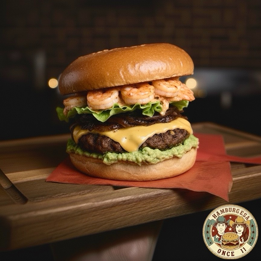 Carne 150gr, camarón, queso manchego, guacamole, lechuga, cebolla caramelizada, tocino, jalapeño y aderezo de la casa.
