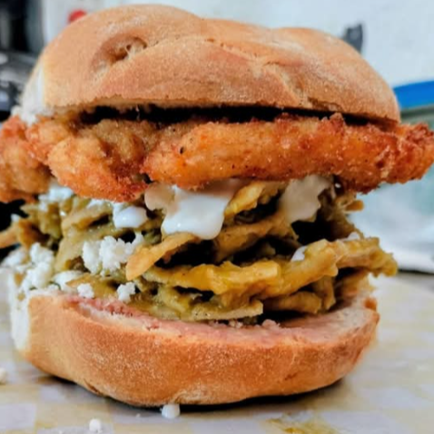 Torta con deliciosos chilaquiles (verdes o rojos), con una milanesa empanizada de pollo y con complementos: frijoles, queso, cebolla, crema.