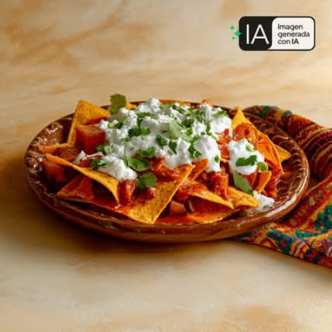 Totopos hechos en casa bañados y salteados en salsa roja o verde con acompañamientos: pollo deshebrado, cebolla, queso, crema y bolillo. porción generosa llena de sabor.