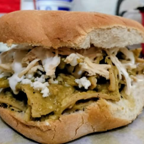 Un bolillo a la mitad, cada uno con frijoles y se pone a la plancha con queso hasta que gratine. y encima una porciones de chilaquiles verdes o rojos. acompañados de pico de gallo y salsa casera.