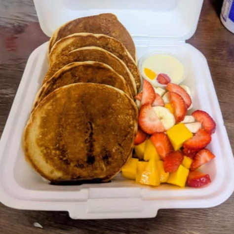 5 hot cakes medianos acompañados con 3 frutas (de temporada). complementos: lechera o maple o miel o cajeta.