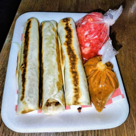 3 burritos de tortilla de harina rellenos con frijoles y choriqueso. con complementos: pico de gallo o lechuga y salsa (receta secreta de la casa).