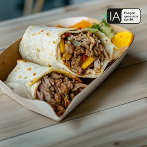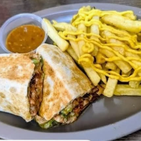 Tortilla de harina gigante, con frijoles y lechuga, con el ingrediente especial: bistec de res y mezcla de quesos. acompañado con papas a la francesa. el toque casero que se nota. con complementos para papas y salsa casera.