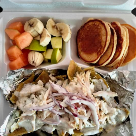 Mini hot cakes con fruta (de temporada) y una rica porción de chilaquiles verdes o rojos con pollo. como complementos: queso, cebolla, crema y bolillo.