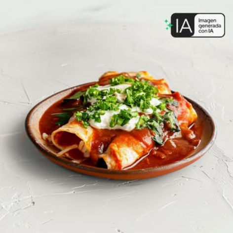 4 tortillas rellenas de queso ranchero deshebrado bañadas en salsa verde o roja acompañadas con queso, crema y cebolla.