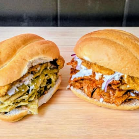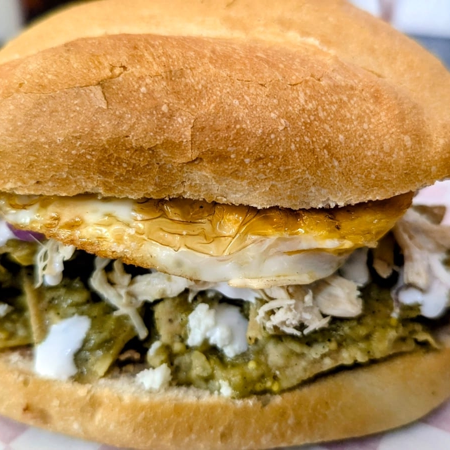Torta con chilaquiles verdes o rojos y pechuga de pollo desmenuzada.