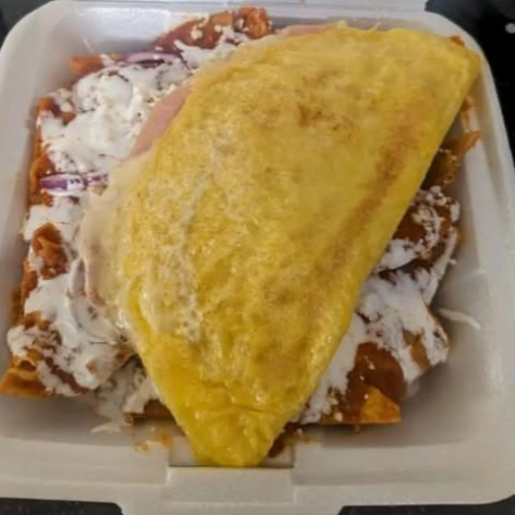 Totopos hechos en casa bañados y salteados en salsa roja o verde con acompañamientos: cebolla, queso, crema y bolillo. y encima una rica tortilla rellena de jamón y mezcla de quesos. no podrás resistirte.