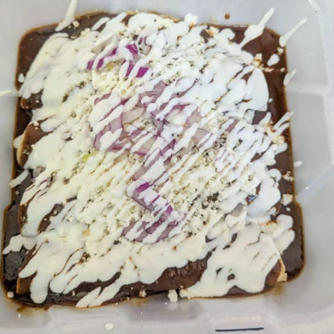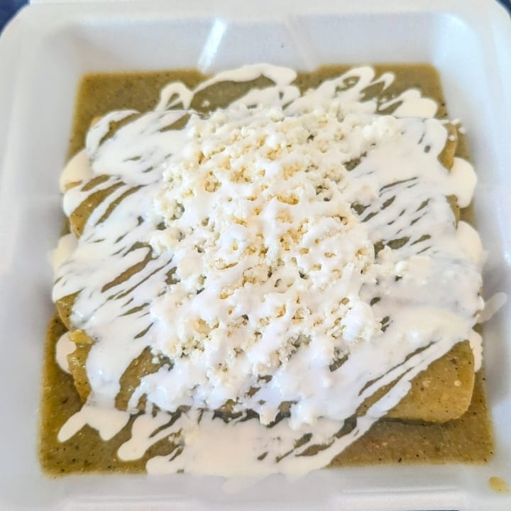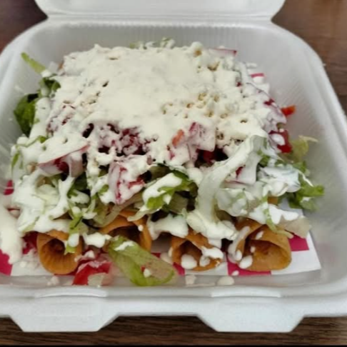 4 tortillas rellenas de pollo deshebrado bañadas en salsa verde o roja acompañadas con queso, crema y cebolla.