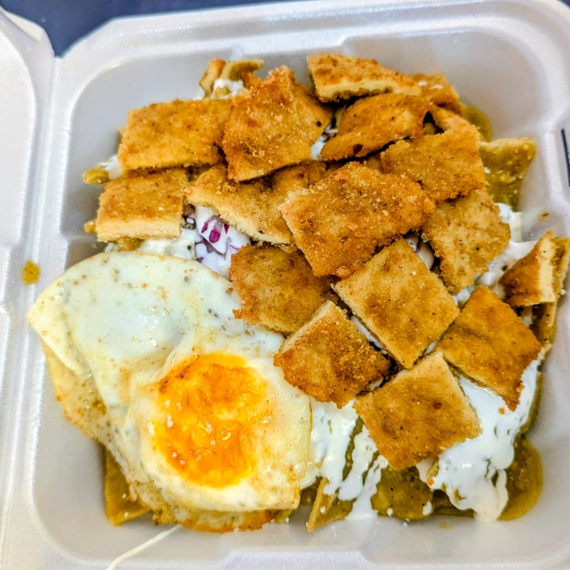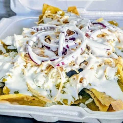 Totopos hechos en casa bañados y salteados en salsa roja o verde con acompañamientos: milanesa empanizada de pollo y huevo estrellado, cebolla, queso, crema y bolillo. porción generosa llena de sabor.