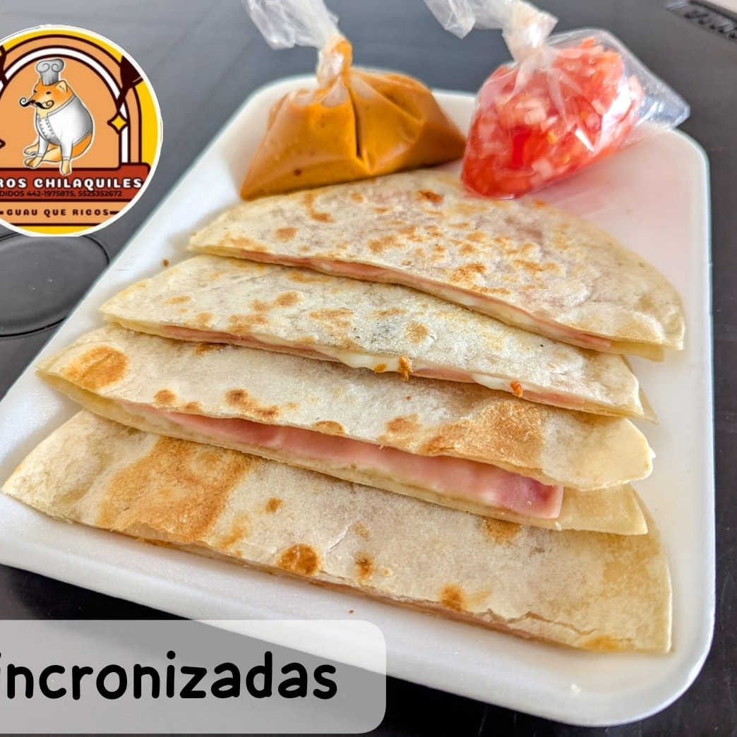 2 sincronizadas rellenas de jamón con mezcla de quesos y con complementos: pico de gallo y salsa (receta secreta de la casa).