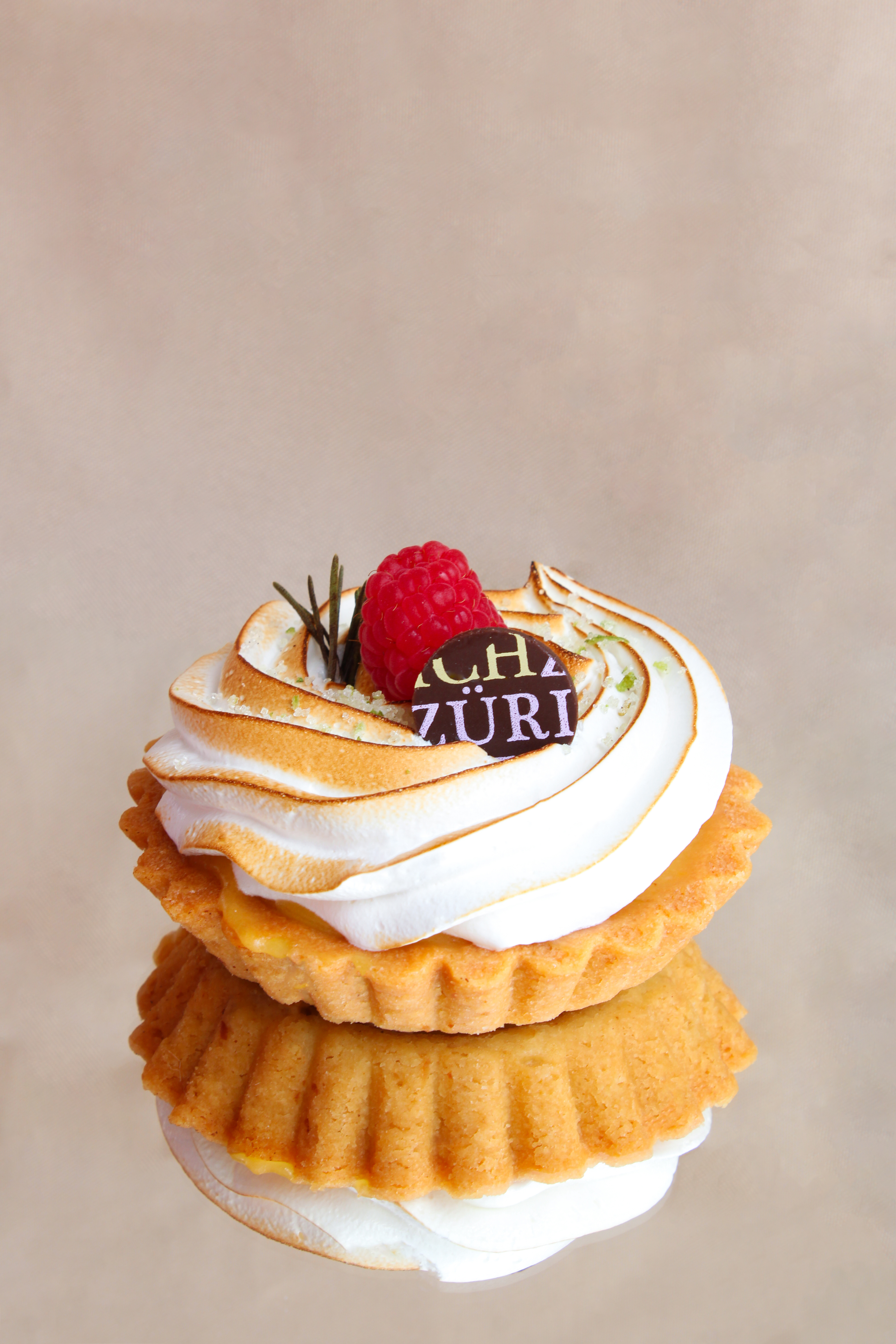 Base sable rellena de una crema suave de limón, decorada con merengue italiano ligeramente flameado.