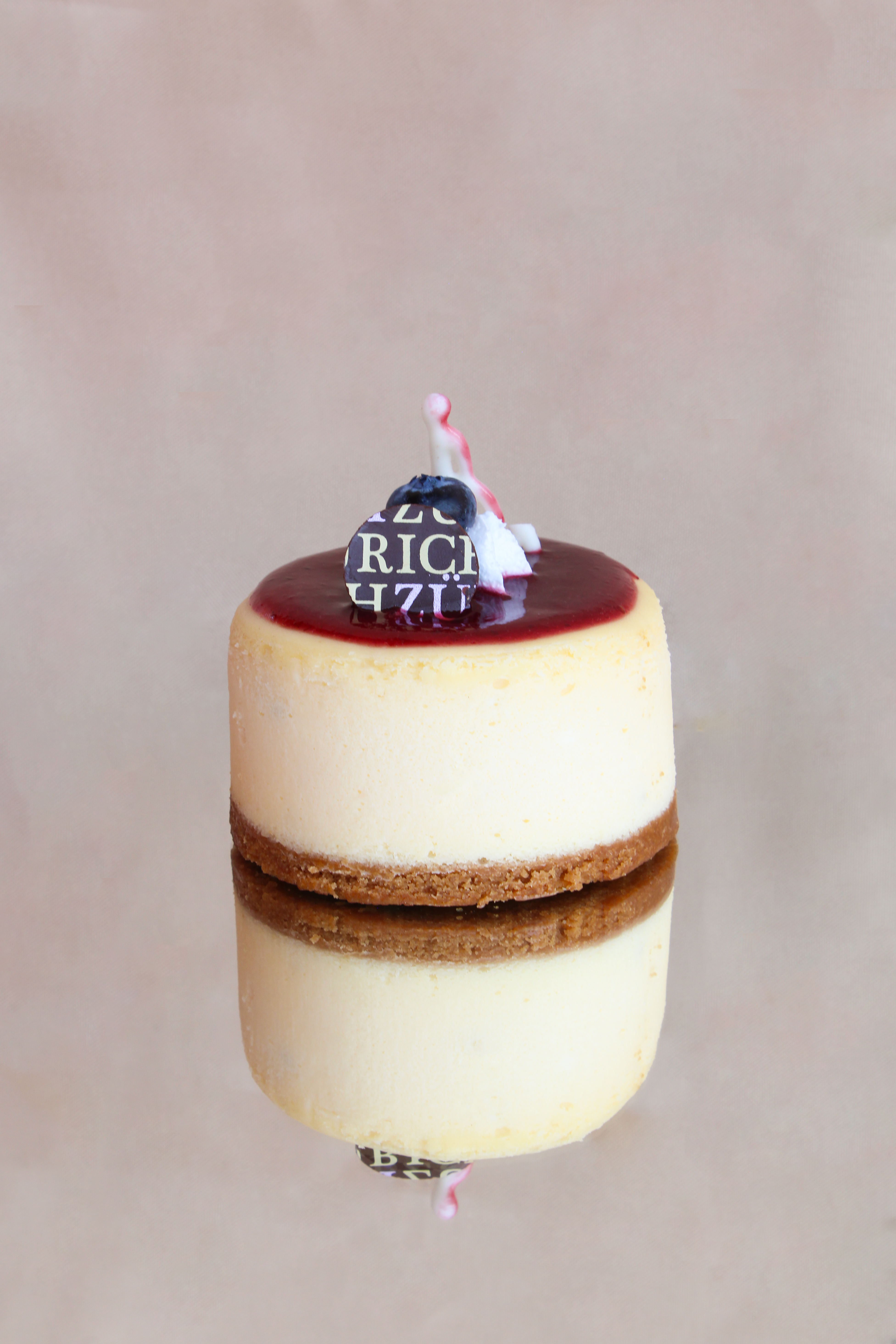 Pastel de queso crema, decorado con coulis de frutos rojos y con fruta fresca.