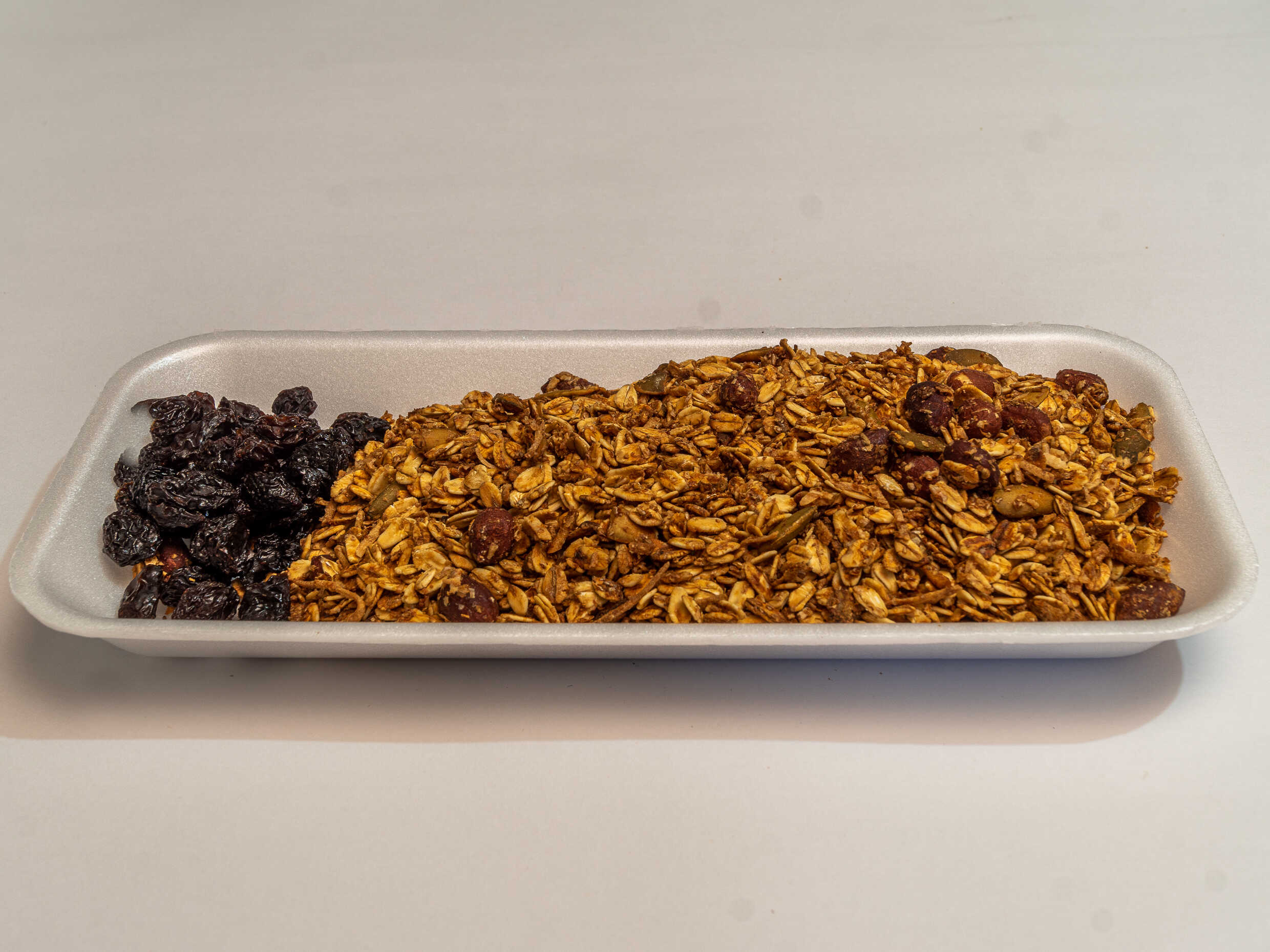 250 gr. de granola casera horneada contiene avena, salvado, coco rallado, pepita, cacahuate.