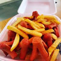 Trocitos de salchicha con papas a la francesa.