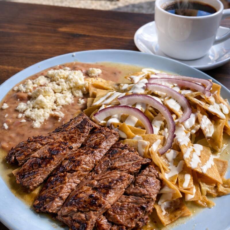 Verdes o rojos, con cebolla, queso y crema. Huevos estrellados, arrachera, picaña, chorizos o pechuga de pollo. Acompañados de frijoles, con café o Té. Sin paquete.