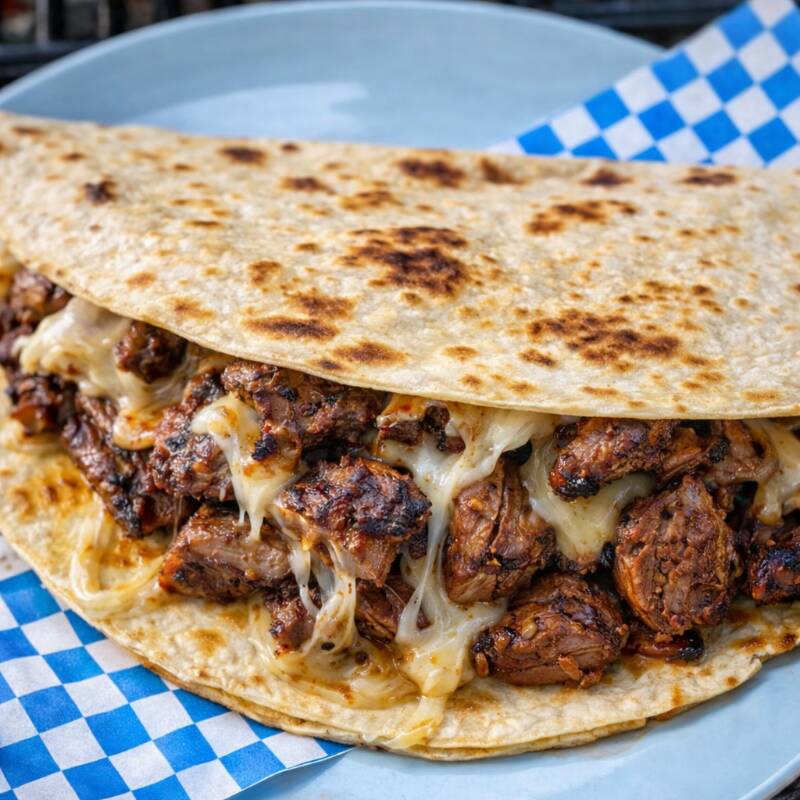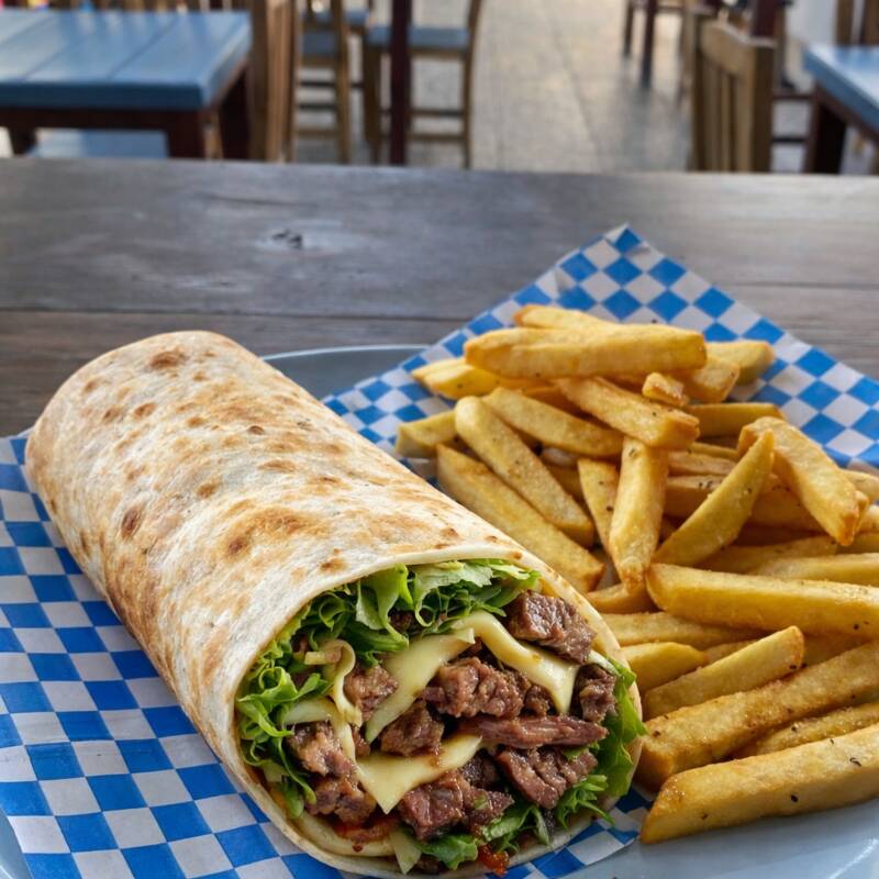 Tortilla de harina con frijoles, queso manchego, arrachera ò picaña ò chorizo, español, argentino ò chistorra, lechuga, cebolla y aderezo de mayonesa.