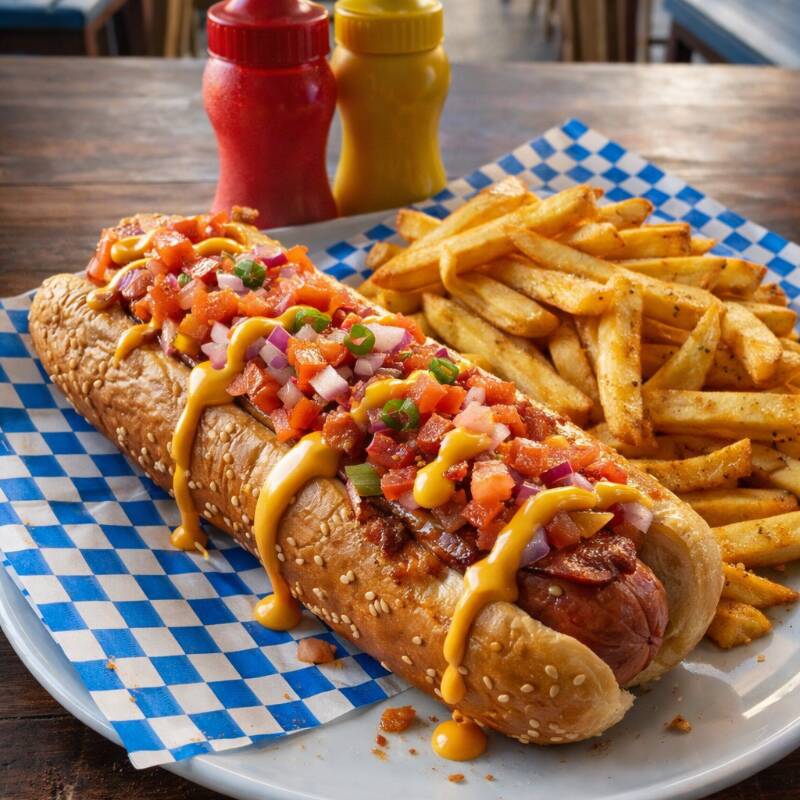 Salchicha y pan jumbo, tocino, jitomate, cebolla y aderezos.