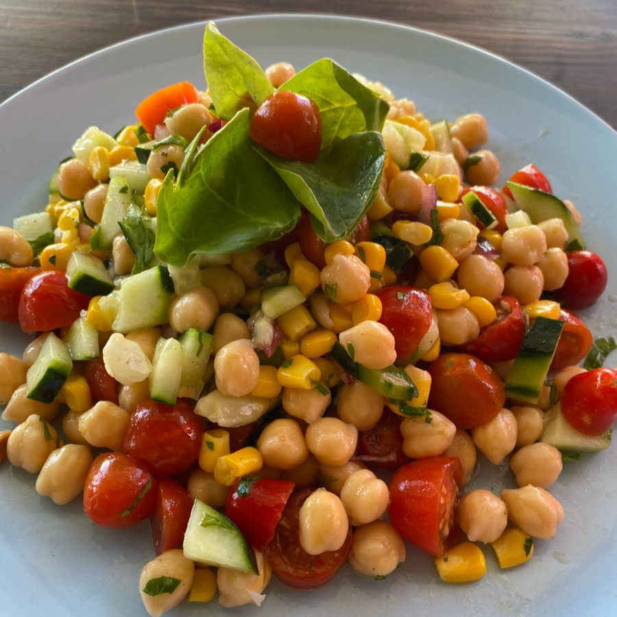 Garbanzos, jitomate, pepino, cebolla y elote. Aderezo de limón con aceite de oliva y perejil ó italiano. Con nuez o cacahuate.