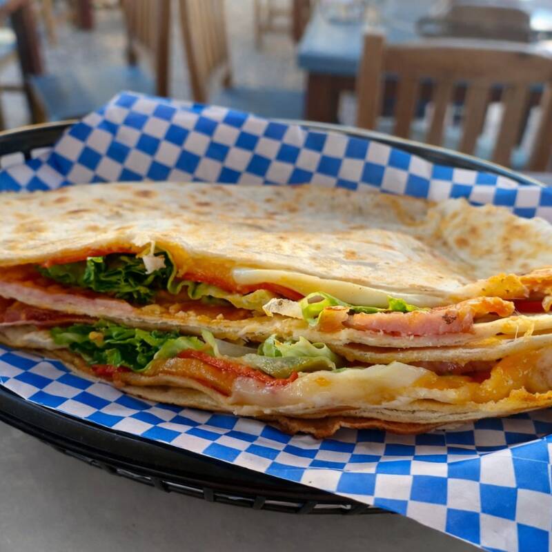 Tortilla de harina, jamón pierna o pechuga de pavo, peperoni, queso gouda, lechuga y jitomate.