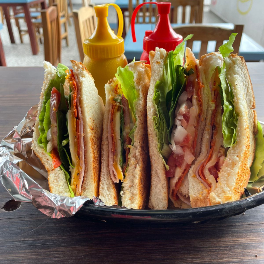 Pan de caja, jamón pierna o pechuga, queso gouda, peperoni, jitomate, cebolla, lechuga y aderezos