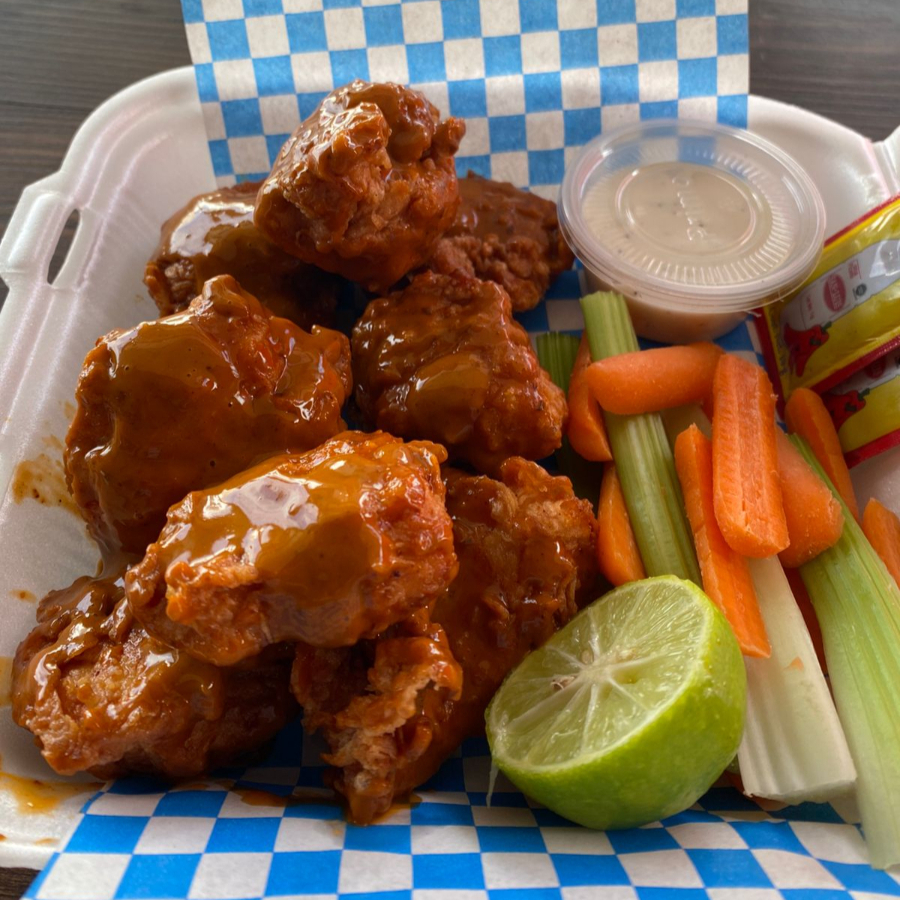 3 salsas a elegir: Bbq, buffalo, mango habanero, pimienta limón, tamarindo y ajo parmesano. Acompañadas de bastones de zanahoria y apio con aderezo ranch.
