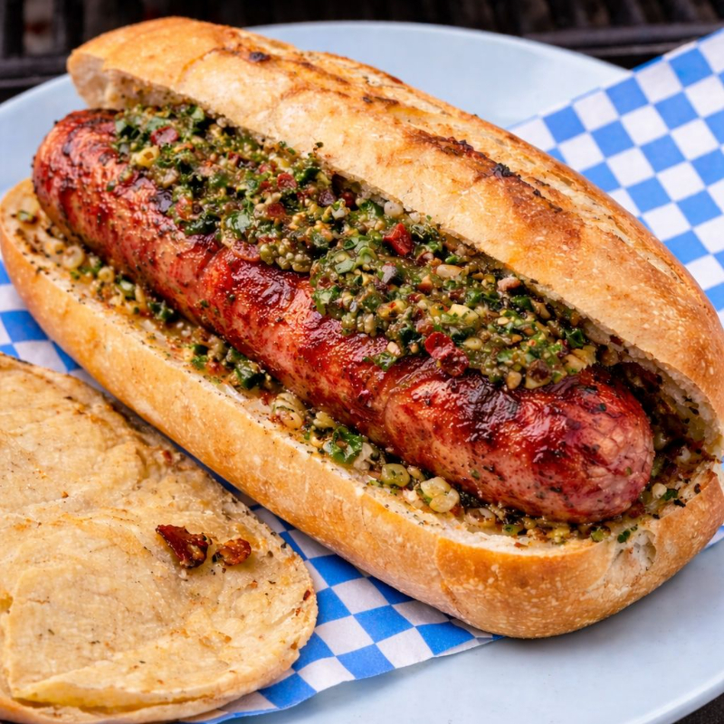Pan tipo bagueth con chorizo argentino ò español aderezo de chimichurri.