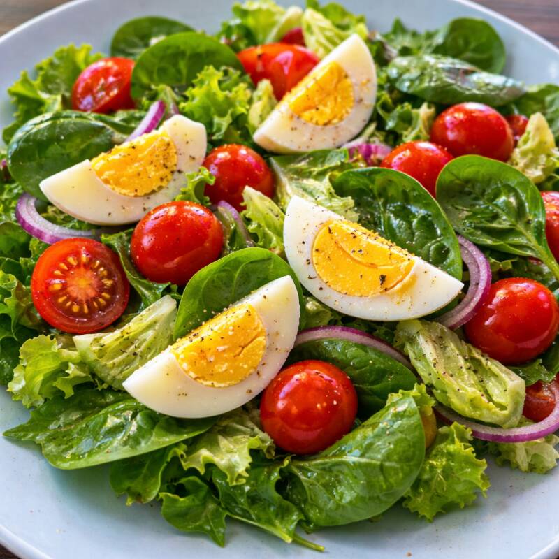 Lechugas, espinaca, jitomate, cebolla y 4 huevo cocido. Aderezo de mayonesa con limón y pimienta ó italiano. Puedes agregarle nuez o cacahuate.