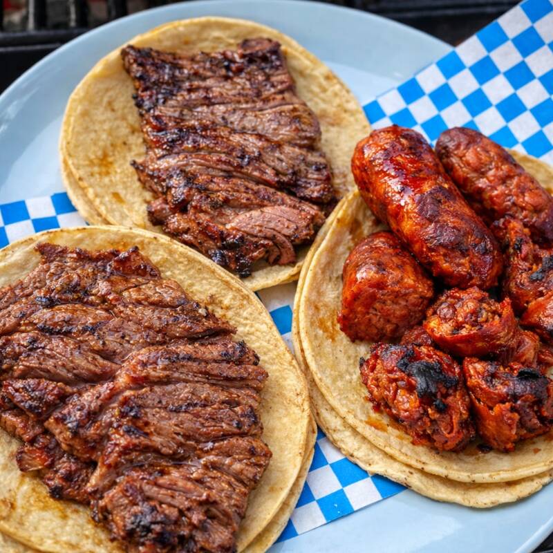 3 tacos con proteína a elección Arrachera, picaña, chorizo español, chorizo argentino o chistorra. 70 g de carne por taco.