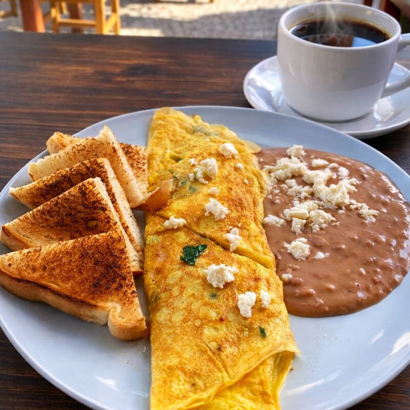 Espinaca con queso, jamón, a la mexicana, tocino, estrellados. Acompañados de frijoles, con café o Té. Sin paquete.