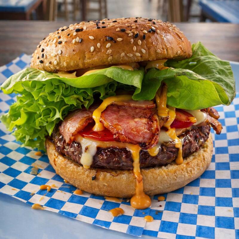 Carne 100% res, queso gouda, tocino, peperoni, jitomate, cebolla, lechuga y aderezos.