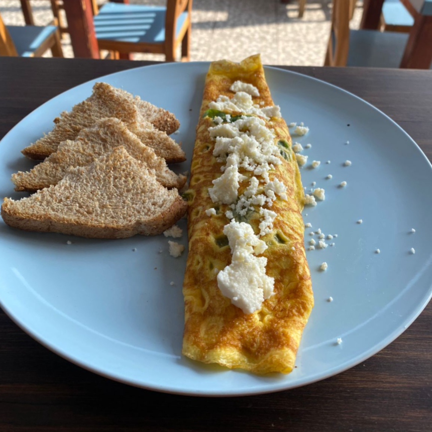 Espinaca con queso, jamón, a la mexicana, tocino, estrellados. Acompañados de pan con mantequilla.