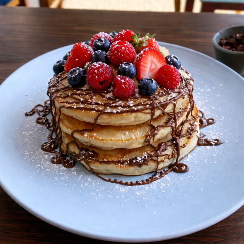 3 pzas., leche, mermelada, dulce de leche, nutella o maple + fruta plátano o frutos rojos. Con café, té o chocolate abuelita.