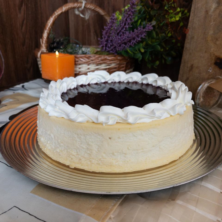 DELICIOSA MEZCLA DE QUESO CREMA CON UN LIGERO TOQUE DE LIMÓN, CUBIERTO CON UN ESPEJO DE ZARZAMORA Y DECORADO CON CREMA