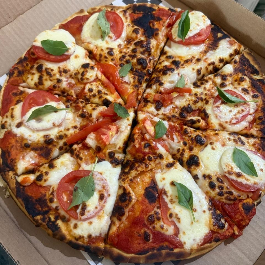 la original de Napoles, con tomate de huerto, albahaca fresca, lajas de queso y aceite. Preparada con masa artesanal y horno de piedra.
