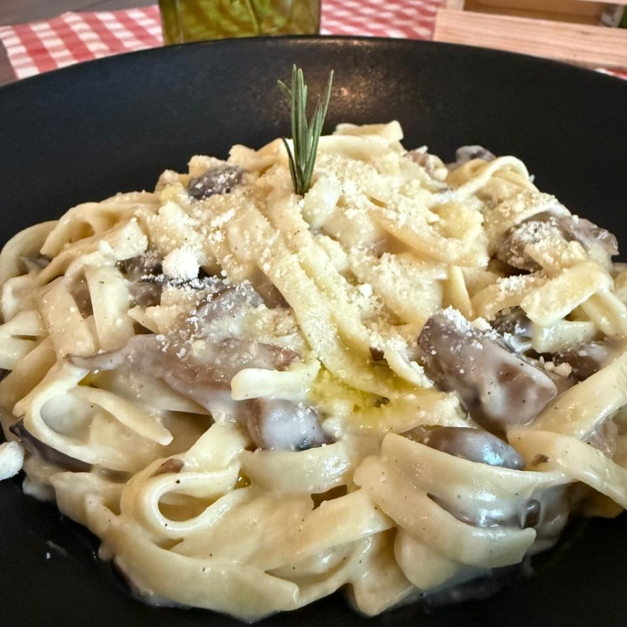 Fettuccine con salsa blanca italiana con quesos, coronada de setas y aceite de trufa negra