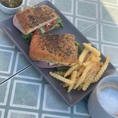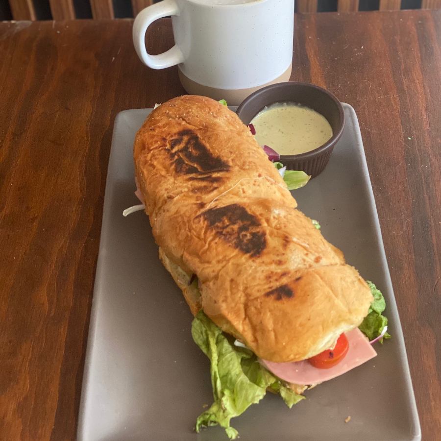 Pan de chile/especias, preparado con jamon de pavo, guacamole, queso panela, mix de lechuga y jitomate.