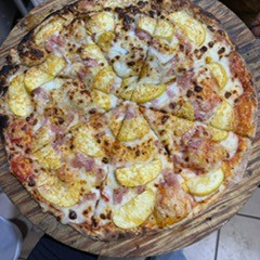Lajas de pera con un toque dulce, queso cabra y reducción de vino tinto. Preparada con masa artesanal y en horno de piedra.