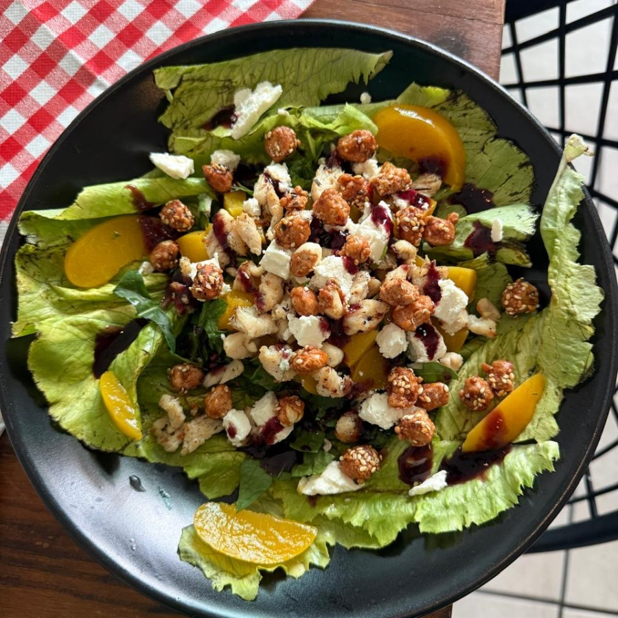 Mix de lechugas, durazno, queso de cabra queretano y aderezo de jamaica