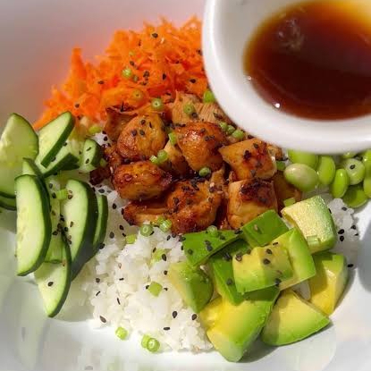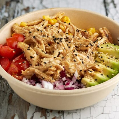 Base de arroz blanco con pollo spicy, pimiento morron, tomate cherry, aguacate, cebolla crujiente, ajonjoli, salsa spicy chipotle y ponzu