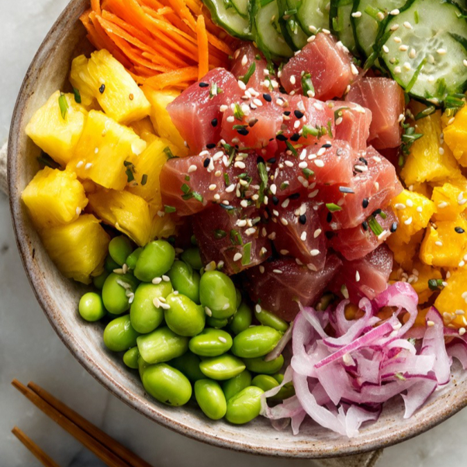 Base de arroz blanco con atun spicy, zanahoria, piña, edamame, pepino, cebolla caramelizada, salsa ponzu y ajonjoli mix