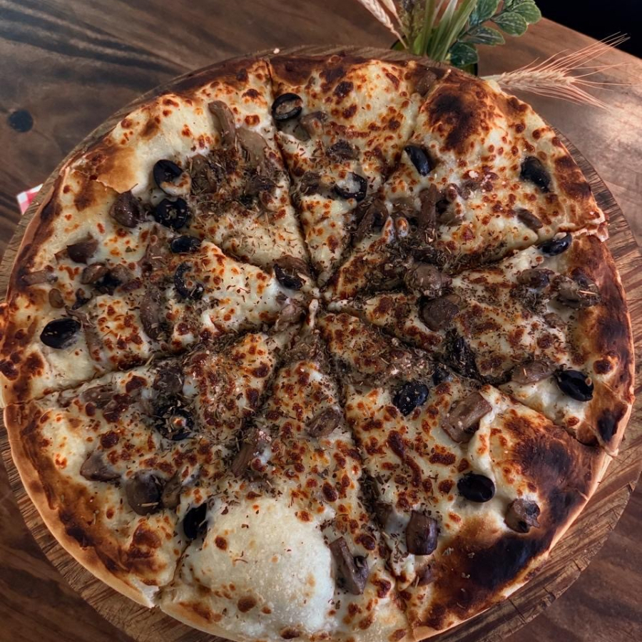 Hongos de temporada salteados, aceitunas negras, aceite de trufa negra y queso mozzarella. Preparada con masa artesanal en horno de piedra.