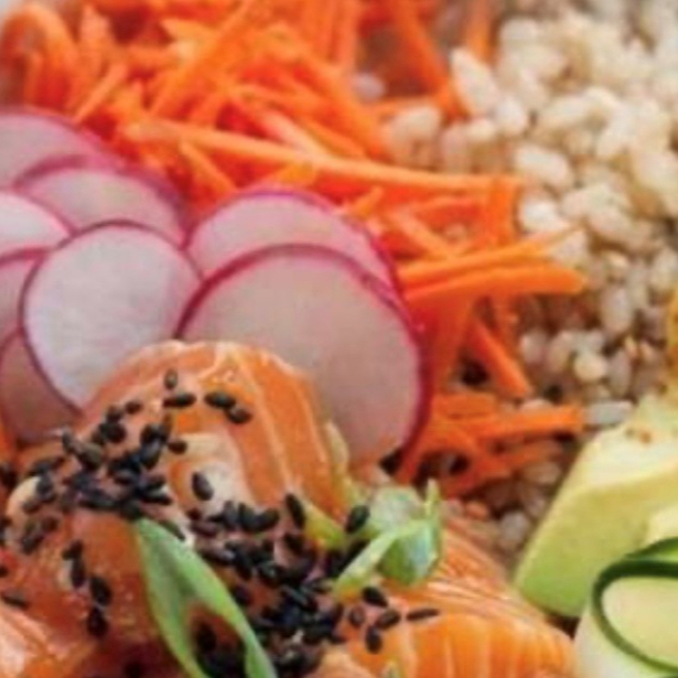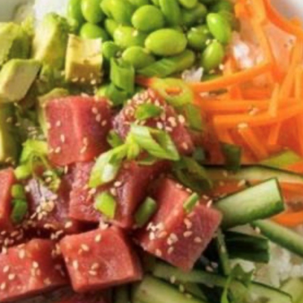 Base de arroz blanco, mix verde, atun noruego spicy, zanahoria, edamame, pepino, cebolla caramelizada, salsa ponzu