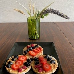 Galleta de arroz con cubierta de crema de cacahuate acompañados de fresa y platano