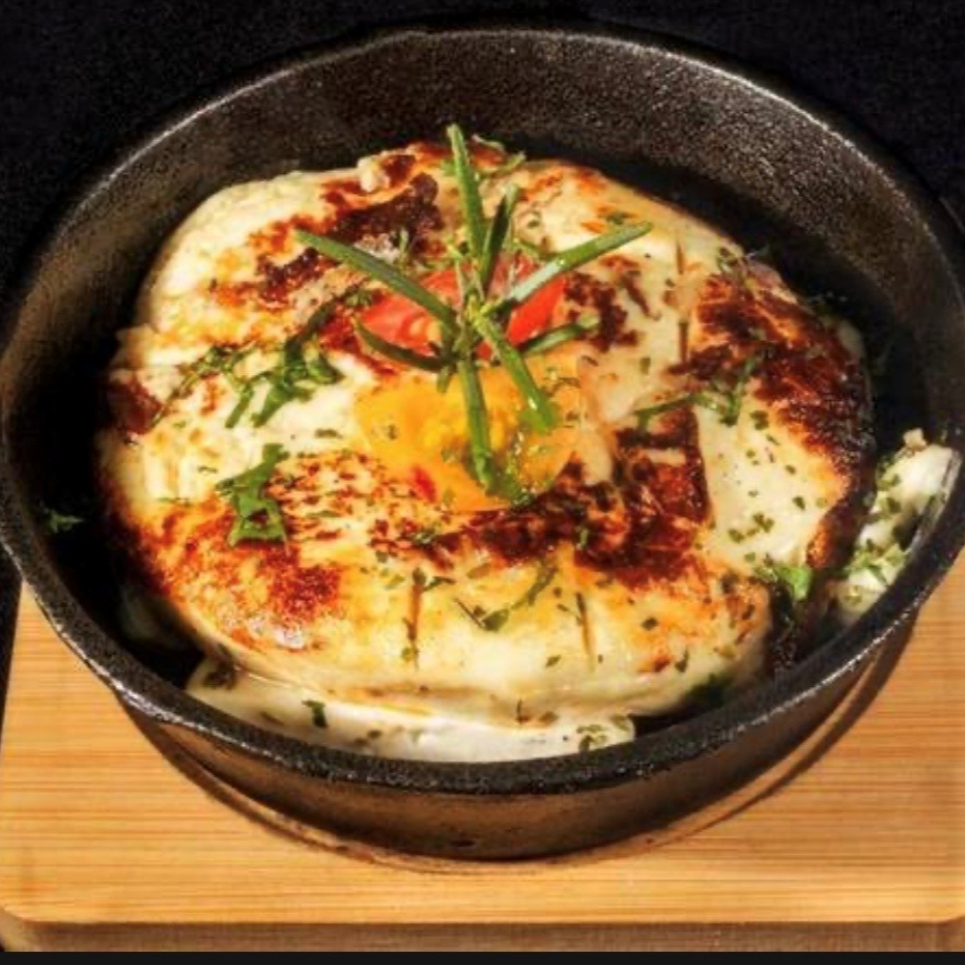 Manzana dorada, tocino, mezcla de quesos y coronada con miel de Amealco. Preparada con masa artesanal en horno de piedra.