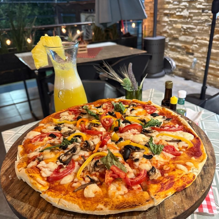 Base de salsa de tomate con mezcla de vegetales de temporada y arugula. Preparada con masa artesanal en horno de piedra.