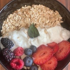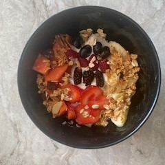 Platano, fresa, blue berry con yogurt griego, coco rallado y granola