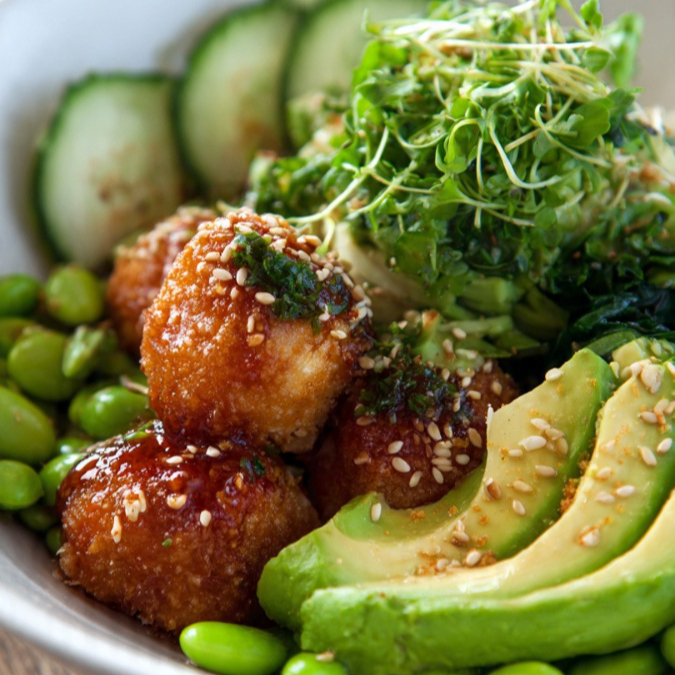 Base de arroz blanco con palomitas de pollo, salsa Tampico, aguacate, edamame, pepino, alga nori y salsa de anguila