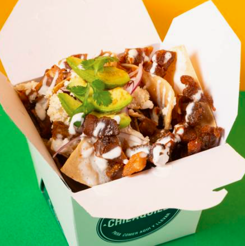 Deliciosos totopos fritos bañados en nuestras salsas con una capa de frijoles y todos los toppings, acompañados de 1 porción de chicharrón prensado.