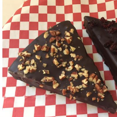 Triángulos de brownie con base de chocolate semi-amargo y toppings de nuez pecana