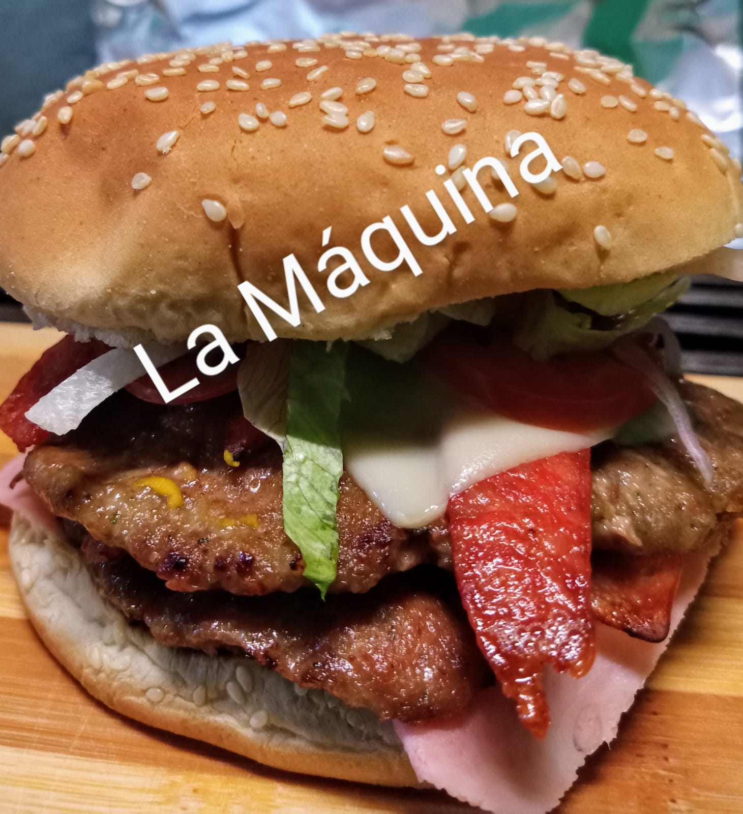 HAMBURGUESA CON DOBLE CARNES, QUESO, TOCINO, CHORIZO, JAMON, PAPAS Y REFRESCO